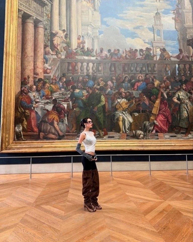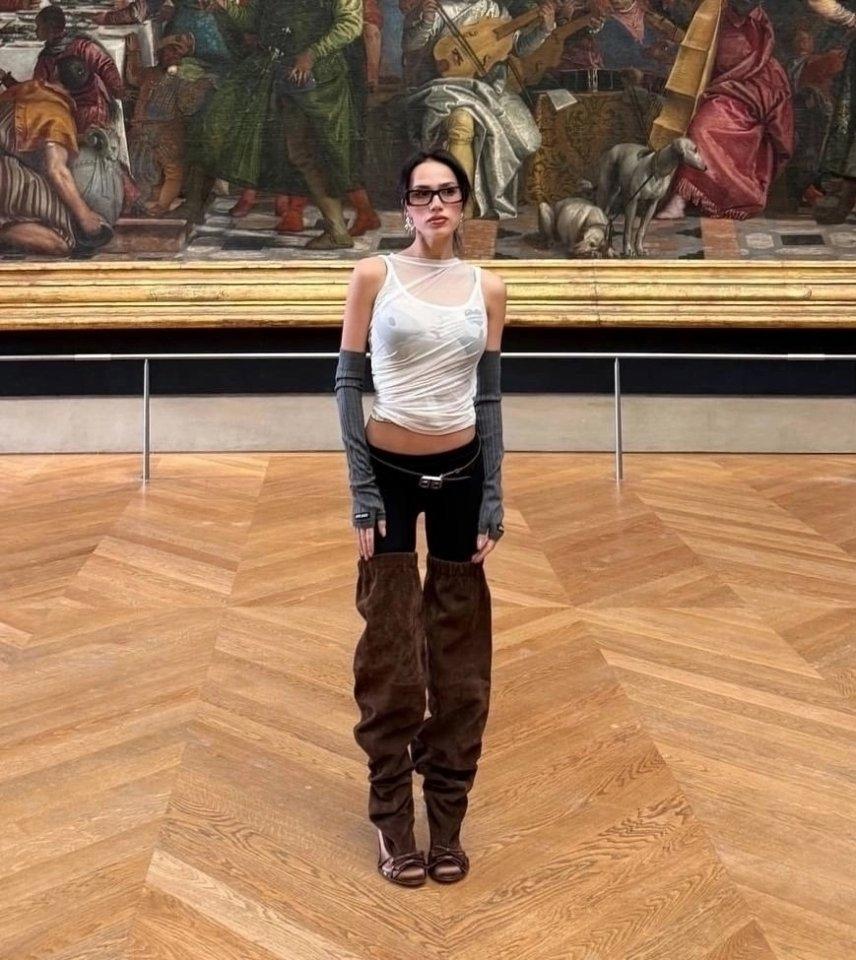 На этот раз обсуждения вызвал её визит в Лувр. Олимпийская чемпионка выбрала дерзкий образ — укороченную майку с прозрачной тканью и контрастным бюстгальтером.