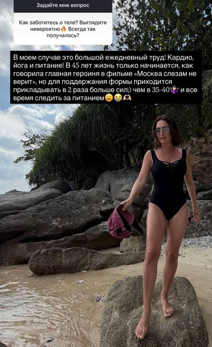 Подписчики не уставали спрашивать, как в 45 лет ей удается выглядеть так свежо и подтянуто. В ответ Вакуленко-Пинская уверенно рассказывала про дисциплину: спорт, кардио, йогу и постоянный контроль питания.