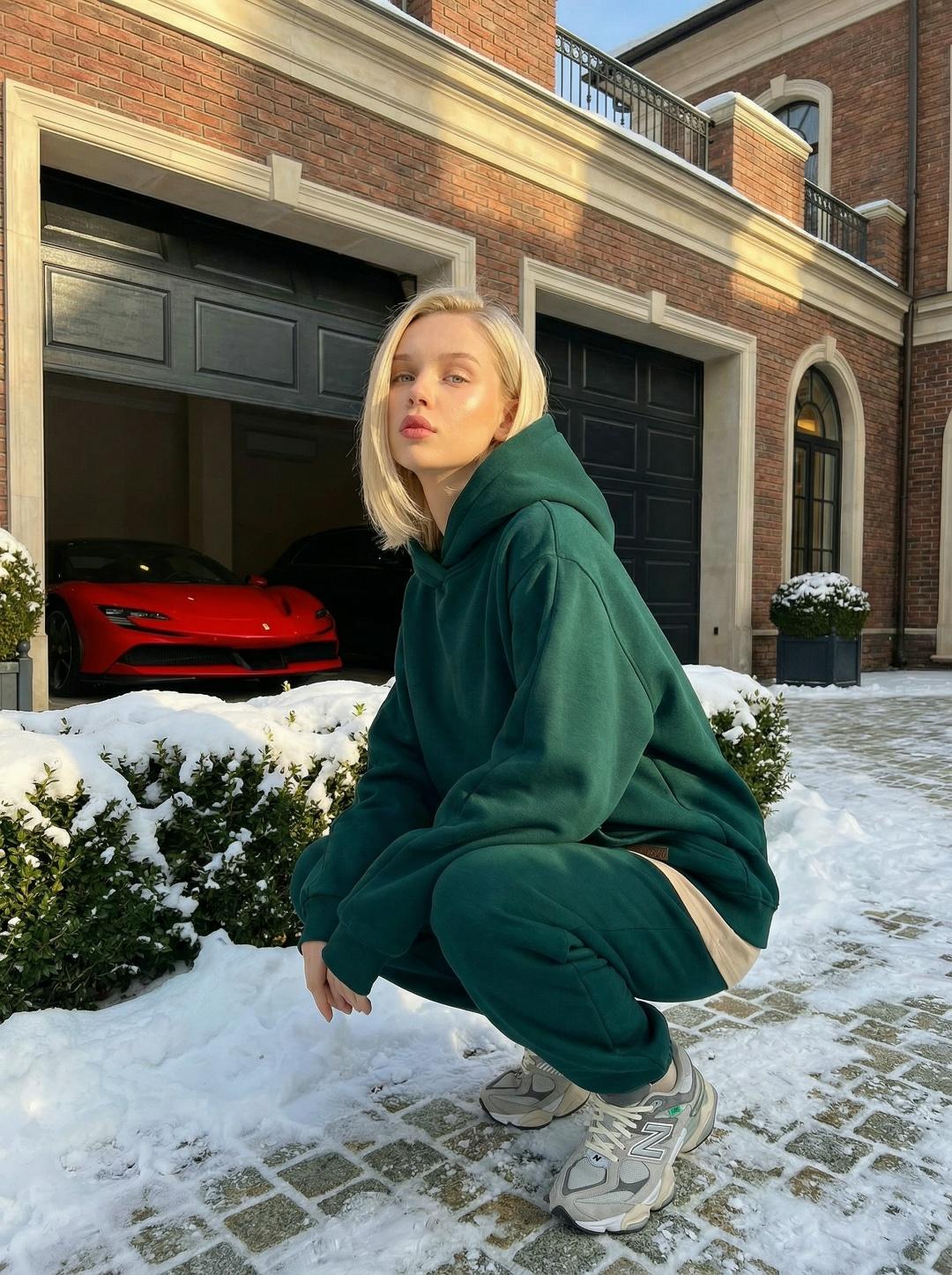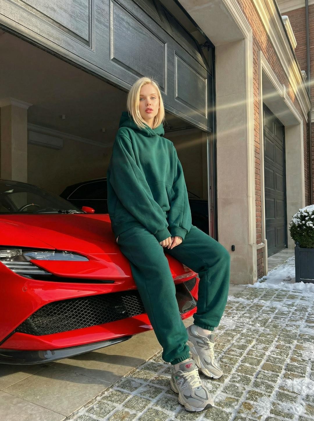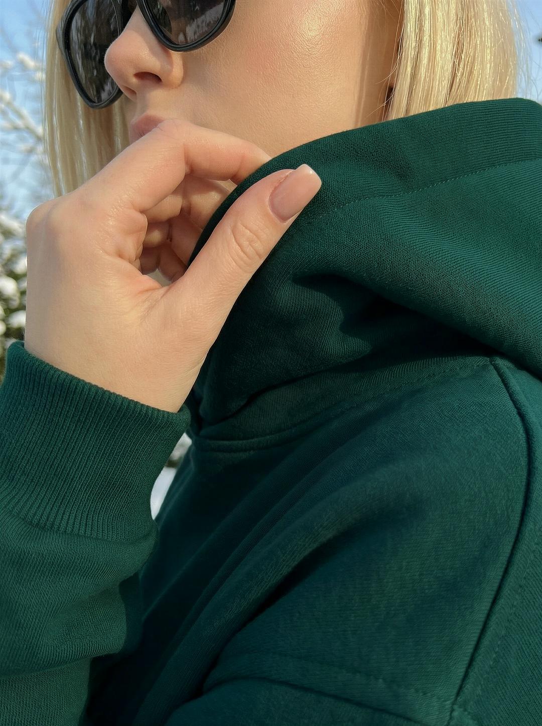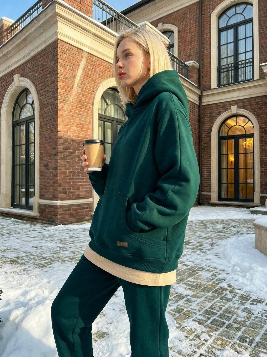 Однотонный oversize-костюм без начёса с худи и брюками в темно-зеленом цвете — уютный, стильный и с характером. Да-да, тот самый оттенок, который сразу делает образ «вкусным» и заметным