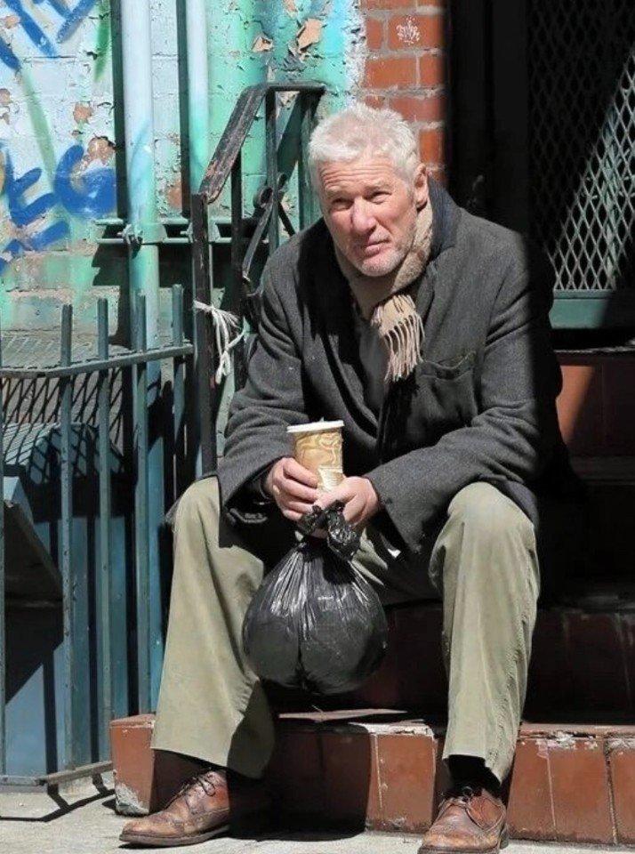 На улице Нью-Йорка к переодетому бедняком Гиру подошла французская туристка Карина Гомбо и вручила ему пакет с едой, приняв голливудского актера за настоящего бездомного.