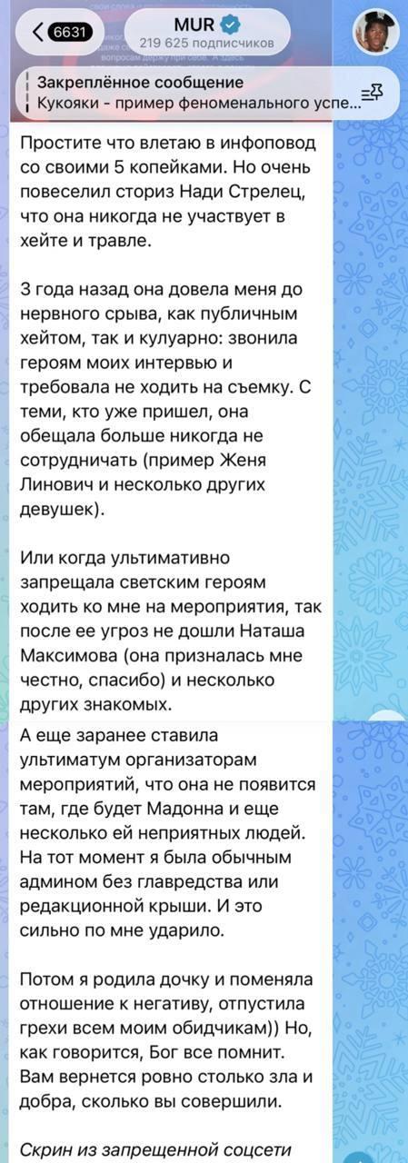 Конфликт в медийной тусовке набирает обороты. Ранее Стрелец сообщила, что подала в суд на школу ораторского искусства, обвинив её в перемонтаже интервью с Еленой Яковлевой и создании «токсичного» ролика ради пиара школы. При этом журналистка подчеркнула, что сама «никогда не участвует в хейте и травле». Именно это заявление спровоцировало резкий ответ Мур.