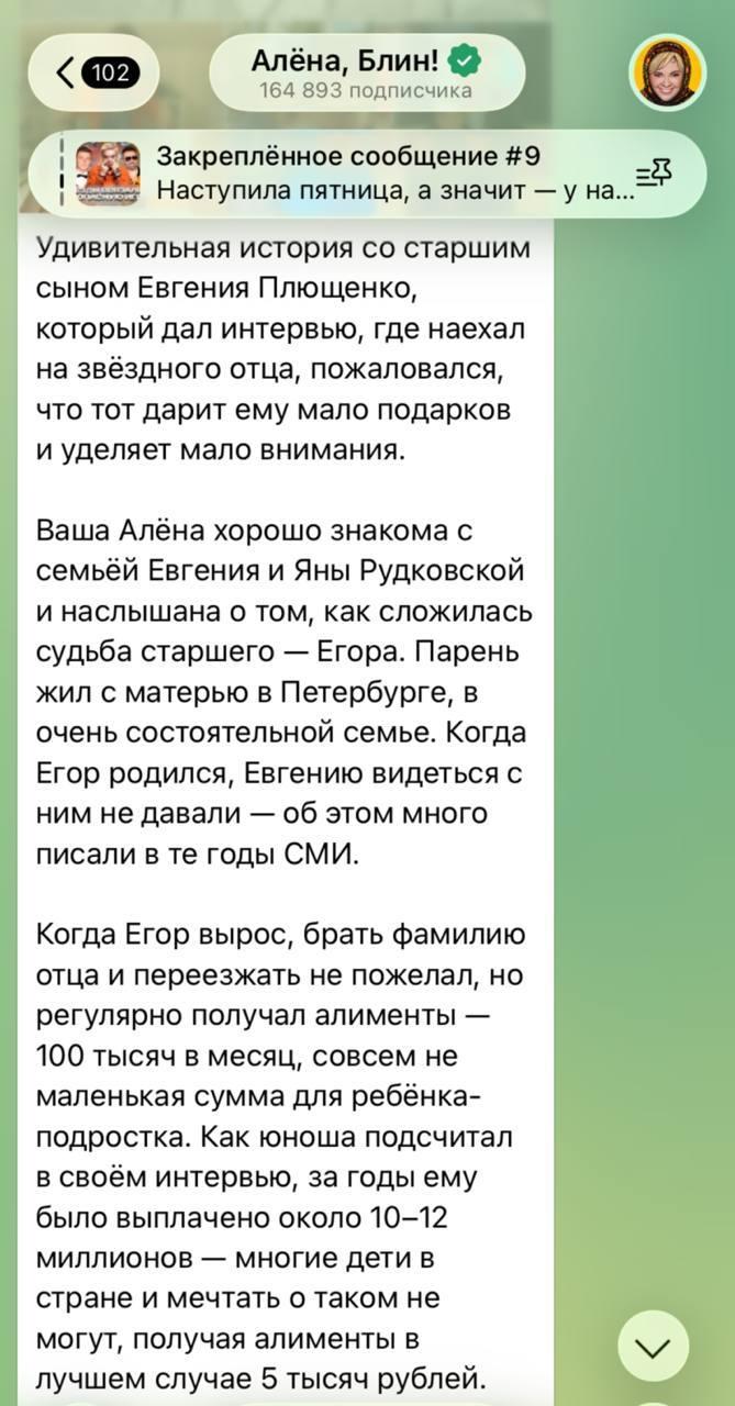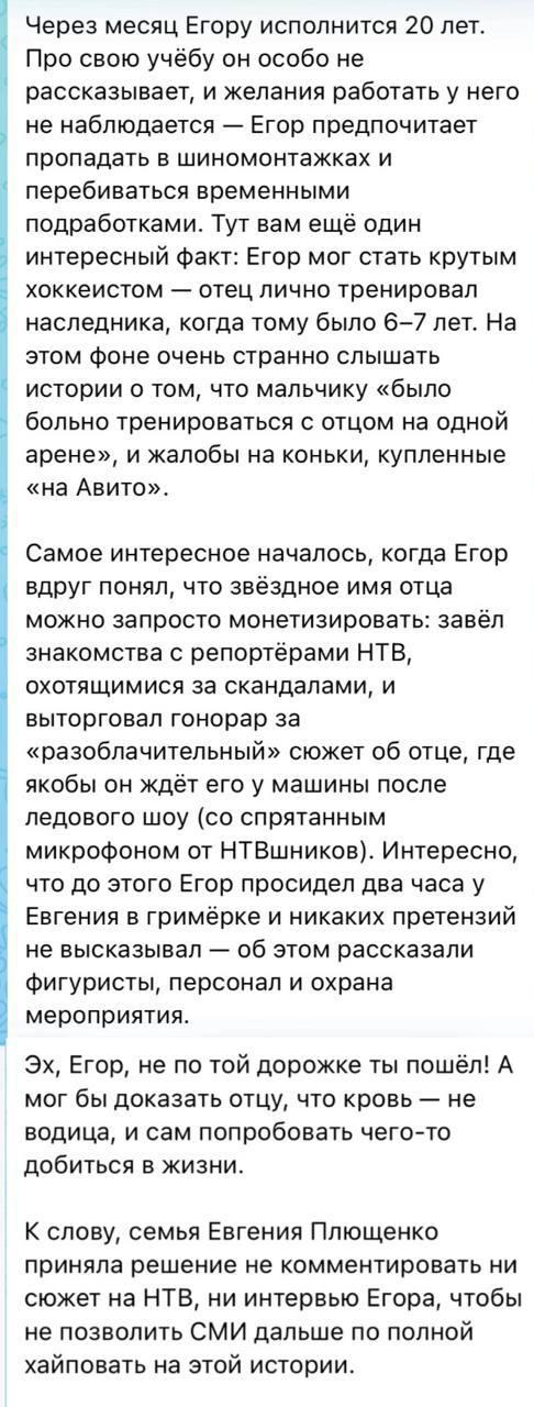 «Самое интересное началось, когда Егор вдруг понял, что звёздное имя отца можно запросто монетизировать: завёл знакомства с репортёрами НТВ, охотящимися за скандалами, и выторговал гонорар за «разоблачительный» сюжет об отце, где якобы он ждёт его у машины после ледового шоу. <...> Эх, Егор, не по той дорожке ты пошёл! А мог бы доказать отцу, что кровь - не водица, и сам попробовать чего-то добиться в жизни», - высказалась журналистка в Телеграм-канале «Алёна, Блин».